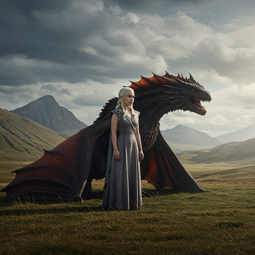 Daenerys Targaryen standing majestically with her dragon beside a sprawling landscape, inspired by Game of Thrones, created by George R. R. Martin. An ultra-wide, photorealistic shot with studio lighting captured using a Phase One camera at ISO 100 in 4K resolution. The scene is in the artistic style of Diego Rivera, photographed with the vibrant flair of David LaChapelle. The atmosphere is vivid and immersive, with an aspect ratio of 2:3, embodying an intense visual quality and depth, and incorporating a sense of epic scale and grandeur.