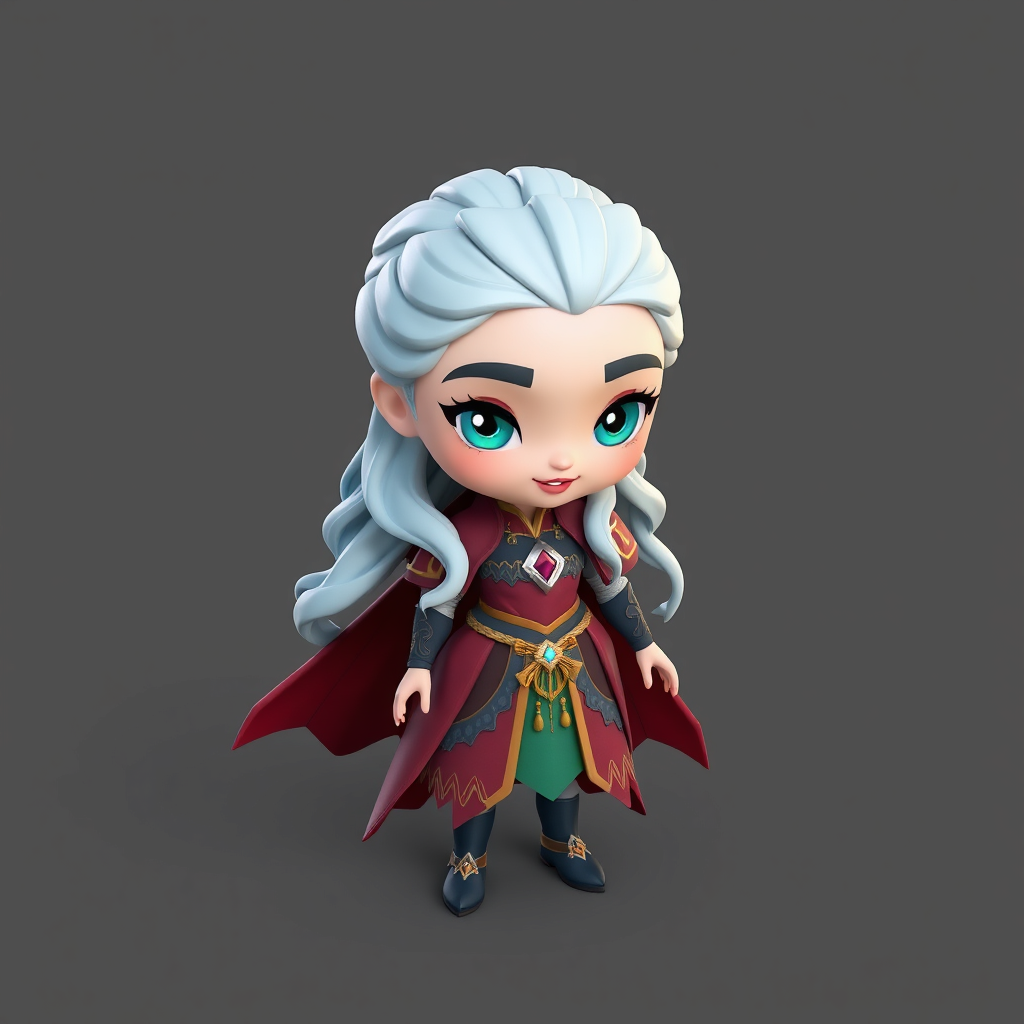 Daenerys Targaryen, stylized isometric full-body 3D model in Blender, influenced by ArtStation and Behance aesthetics, featuring a Disney Pixar charm. Designed as an adorable mobile game character akin to Clash Royale, with a whimsical yet regal appearance, vibrant colors, and expressive features that blend fantasy epic with playful animation style.