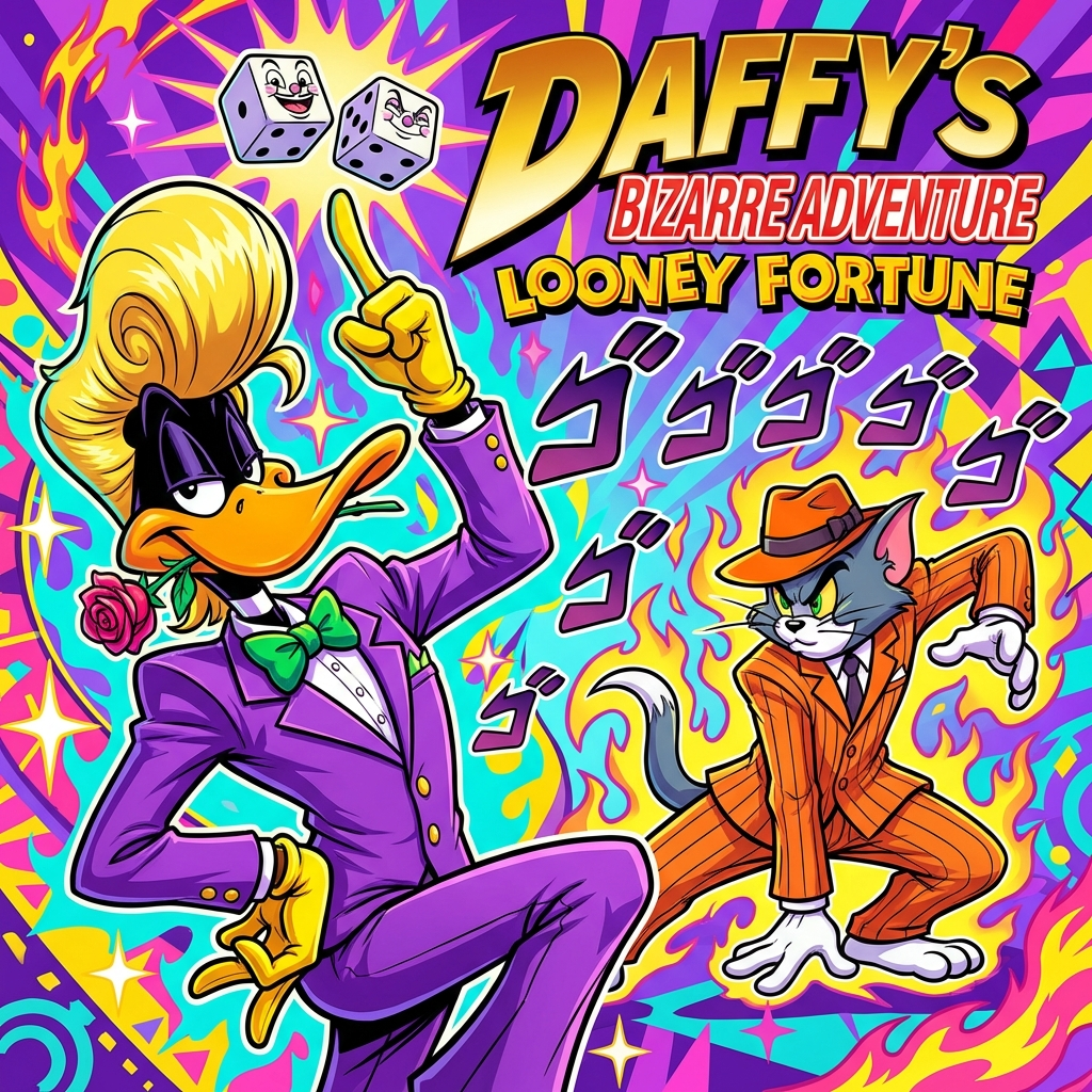 A vibrant anime-style comic book cover, featuring Daffy Duck and Tom Cat in "JoJo's Bizarre Adventure" poses. Daffy Duck on the left, wearing a purple suit, green bow tie, and a rose in his mouth, with a large blonde pompadour and yellow gloves, pointing upwards. Tom Cat on the right, in an orange pinstripe suit and fedora, striking a dramatic pose. Two floating dice with cartoon characters on them are above Daffy's hand. The background is a psychedelic swirl of purple, yellow, pink, and turquoise geometric shapes and flame-like aura, with Japanese sound effects "ใดใดใดใด" (gogogogo) in purple. The title "DAFFY'S BIZARRE ADVENTURE LOONEY FORTUNE" is prominently displayed in bold, stylized lettering. Dynamic lighting, high contrast, vivid colors, and a maximalist, energetic atmosphere.