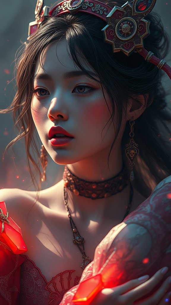 Dalcefo, 1girl, modelshoot style, intricate details, masterpiece, cinematic lighting, dramatic, trending on ArtStation, highly detailed body and face, ultra resolution, painting art inspired by Greg Rutkowski and Ruan Jia with Ilya Kuvshinov fantasy ambiance, surreal colors, dynamic composition, imaginative elements, abstract details, captivating expression, immersive atmosphere, fantasy setting, vivid textures, innovation in design, digital art exploration, unique character portrayal, imaginative scenery, ethereal quality, striking color palette, fantastical elements, artistic elegance, storytelling through visuals, enhanced creativity, surreal ambiance.
