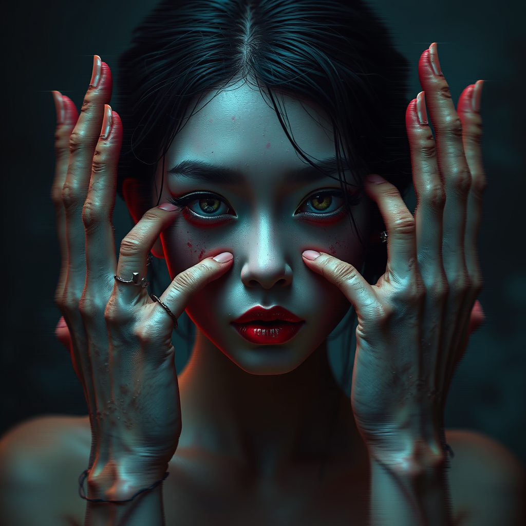 Dalcefo, 1girl, modelshoot style, intricate details, masterpiece, cinematic lighting, dramatic, trending on artstation, highly detailed body, highly detailed face, ultra resolution, painting art by Greg Rutkowski and Ruan Jia, Ilya Kuvshinov fantasy ambiance canvas frame, 3d, surreal colors, partially blurred, artistic chaos, additional fingers, unusual hands, duplicated facial features, off-frame composition, peculiar limbs, unconventional proportions, digital mishap, tiling effect, unconventional anatomy, cross-eyed, incomplete body framing, blurred presentation, experimental art, creative distortion, abstract 3d rendering.