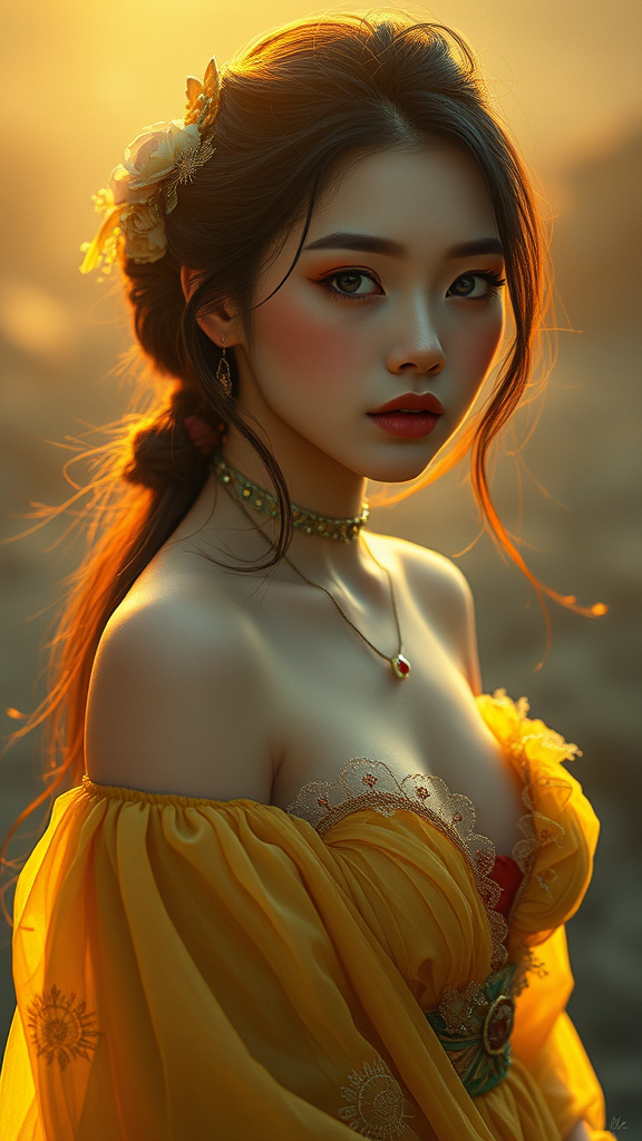 Dalcefo style, featuring one girl in a cinematic model shoot setting, with intricate detailing and dramatic, masterpiece-level artistry. The composition should embody the style of renowned artists Greg Rutkowski, Ruan Jia, and Ilya Kuvshinov, infused with a fantasy ambiance. The artwork should be presented in ultra-resolution, emphasizing highly detailed facial features and body structure. The piece should maintain a painterly quality with a hint of 3D depth and subtle surreal elements. While maintaining the core essence, incorporate a touch of abstract color use and slight blurriness to evoke a dreamlike atmosphere. Ensure the anatomy and proportions stay graceful, avoiding extra or misplaced limbs and faces. The overall tone should remain elegant and aesthetically pleasing, without any disfigurements or distortions, encapsulating a harmonious blend of art styles.