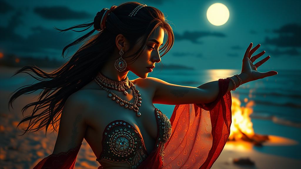 dancer adorned with shimmering jewelry by the glowing fire on a moonlit beach, inspired by the styles of magali villeneuve and eve ventrue, capturing realistic light with a touch of luminous pointillism, reminiscent of daz3d with a hint of sultan mohammed's artistic flair, against a backdrop of charred textures, --ar 9:16 --anime inspired details, expressive style, vivid atmosphere, --s 500