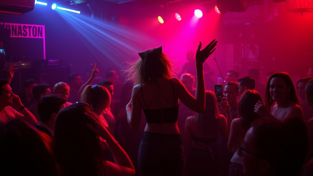 Dancing in a dimly lit club, the energy is electrifying as the music pulses through the air. Neon lights flicker, casting vibrant hues on the crowd moving in rhythmic harmony. In the center, a pop icon performs with an intensity that captures the essence of her liberated spirit. The atmosphere is charged with mystery and allure, as shadows weave through the crowd, creating an aura of enigmatic allure. Every beat echoes a story of passion and resilience, embodying the captivating power of a star who burns brightly even in the darkest moments.