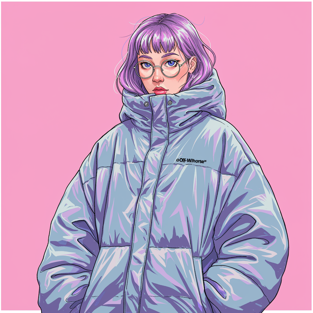 Dangerhorse, a 30-year-old woman in an oversized, poncho-style puffer jacket, drawing inspiration from Off-White and Tumblr aesthetics. Influenced by the unique style of Yanjun Cheng, this digital artwork captures the essence of the lofi girl internet meme with a modern twist. Designed to trend on Dezeen, it features a catalog photo feel, with elements echoing the creativity of artists like Beeple, Rhads, and Lois van Baarle. The cartoon-style illustration is brought to life with bright pastel colors, reminiscent of retro anime aesthetics, blending a sense of nostalgia and innovation to create a captivating visual piece.