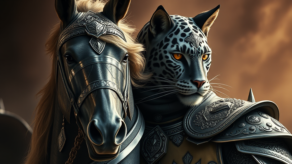Dangerhorse and feline warrior, regal portrait, exquisitely crafted armor, elaborate pattern, shimmering silver, luxurious silk, dramatic cinematic lighting, ultra-high-definition. Include subtle creative twists to enhance depth and visual impact.
