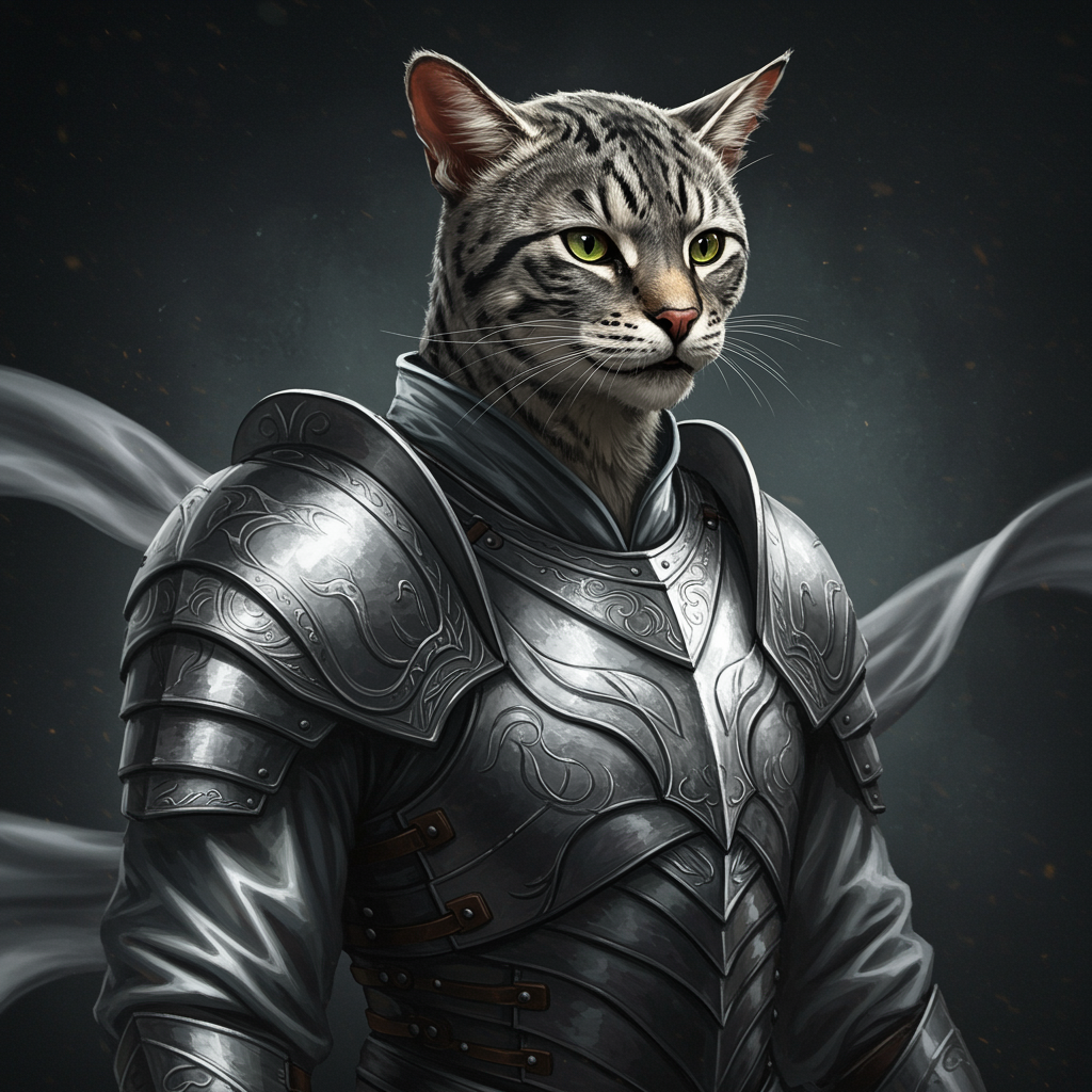 dangerhorse cat warrior portrait masterfully detailed armor elaborate design silver silk dramatic lighting ultra-high-definition