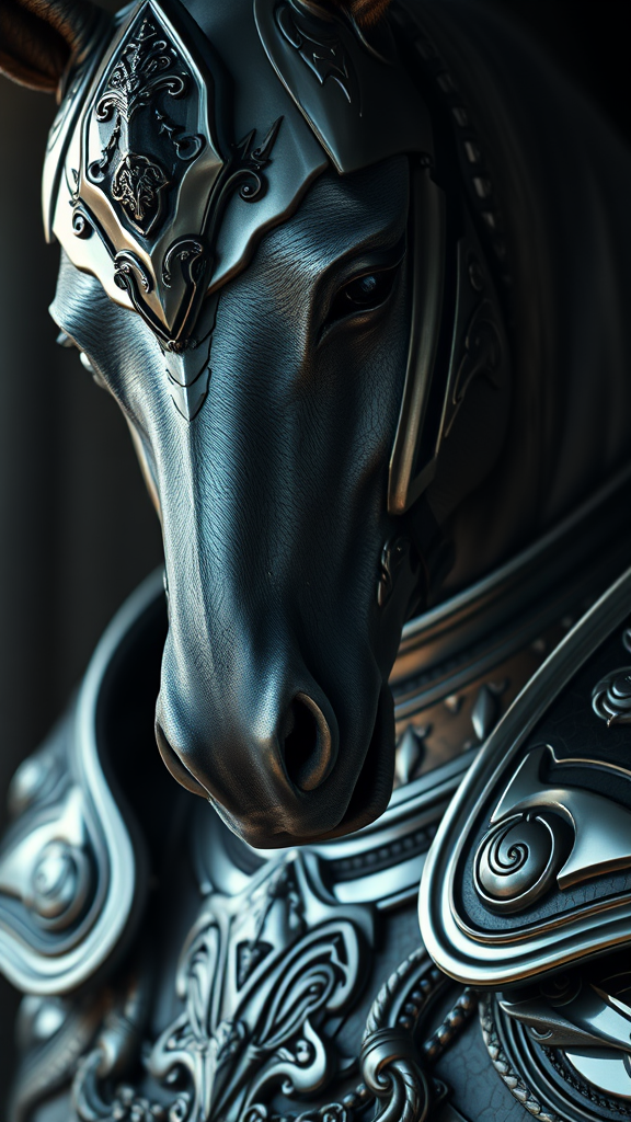 Dangerhorse, close-up portrait, intricately detailed armor with elegant design, silver and silk textures, dramatic lighting, ultra-high-definition, atmospheric, subtle negative space enhancements, refined image quality control.