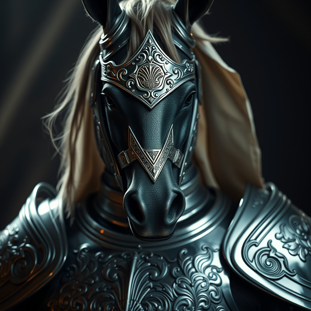Dangerhorse portrait featuring exquisitely detailed armor with intricate designs, crafted from lustrous silver and elegant silk, illuminated by dramatic cinematic lighting, in 4k resolution, with factors to minimize negative aspects like poor quality or undesirable image outcomes.