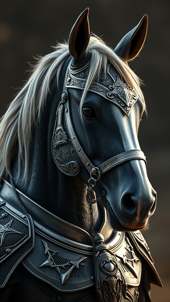 Dangerhorse portrait featuring finely detailed armor with an intricate design, crafted from silver and embellished with silk elements; the scene is enhanced by cinematic lighting and captured in stunning 4k resolution, highlighting the majesty and elegance of the creature while subtly incorporating elements to ensure clarity and aesthetic appeal.