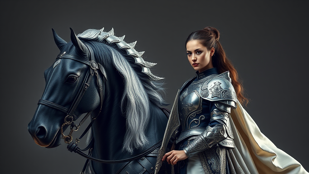 Dangerous steed, elegant woman portrait, exquisitely detailed armor, complex design, gleaming silver, luxurious silk, dramatic lighting, ultra-high definition, intricate negative space, subtle negative detailing, masterful image composition.