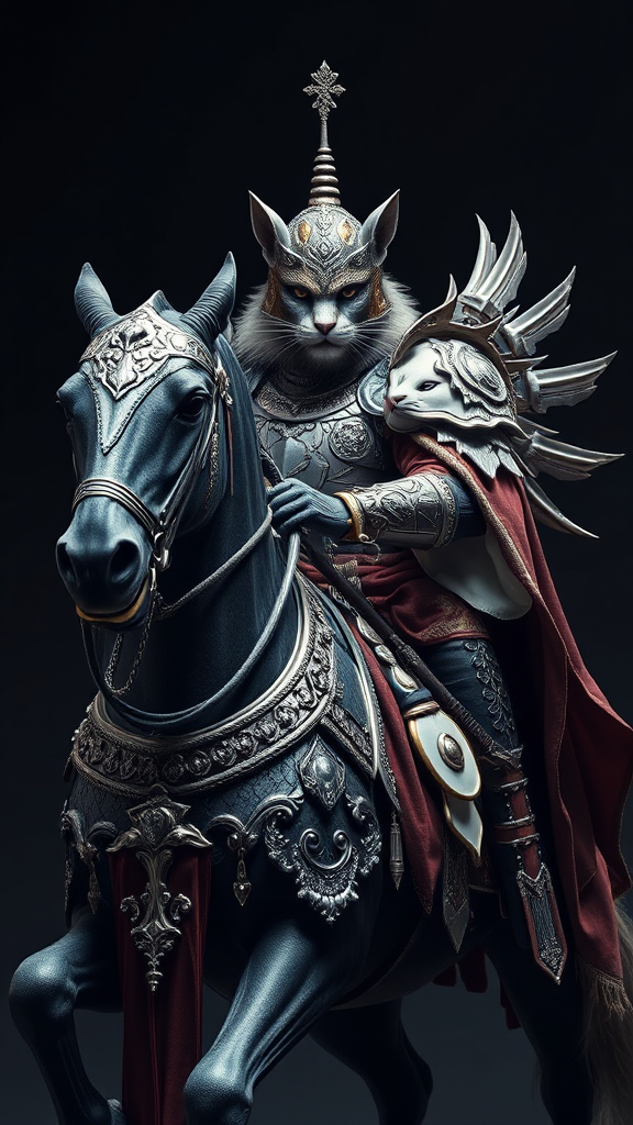 Dangerous steed, feline warrior, regal portrait, exquisitely detailed armor, elaborate design, shimmering silver, luxurious silk, dramatic lighting, 4k resolution, subtle negative space, smooth image correction, impeccable visual quality.
