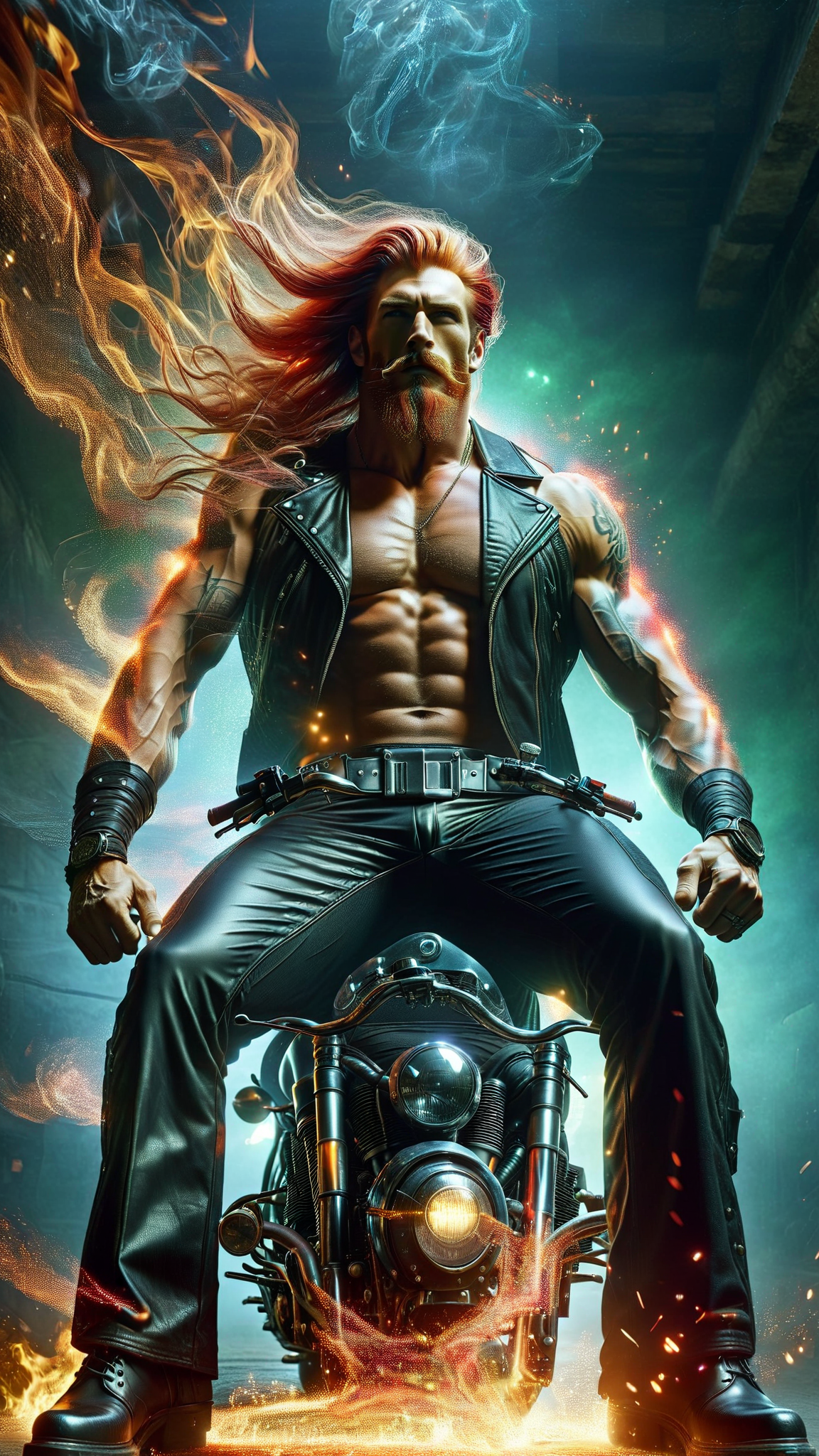 Dangerously sexy. Male motorcycle/biker gang member. Heavy Metal, Hard Rock. Mature man, handsome face, thick red goatee, jade green eyes, masculine, manly, very tall, muscular, sinewy, broad chest, big biceps. long wild locks of flaming red hair, slightly hairy chest, tattoos on arms and chest. Black leather vest exposing chest. black leather pants and boots, studded belt around waist. Surly grin. lying back, legs open, huge crotch. Full body pose.
