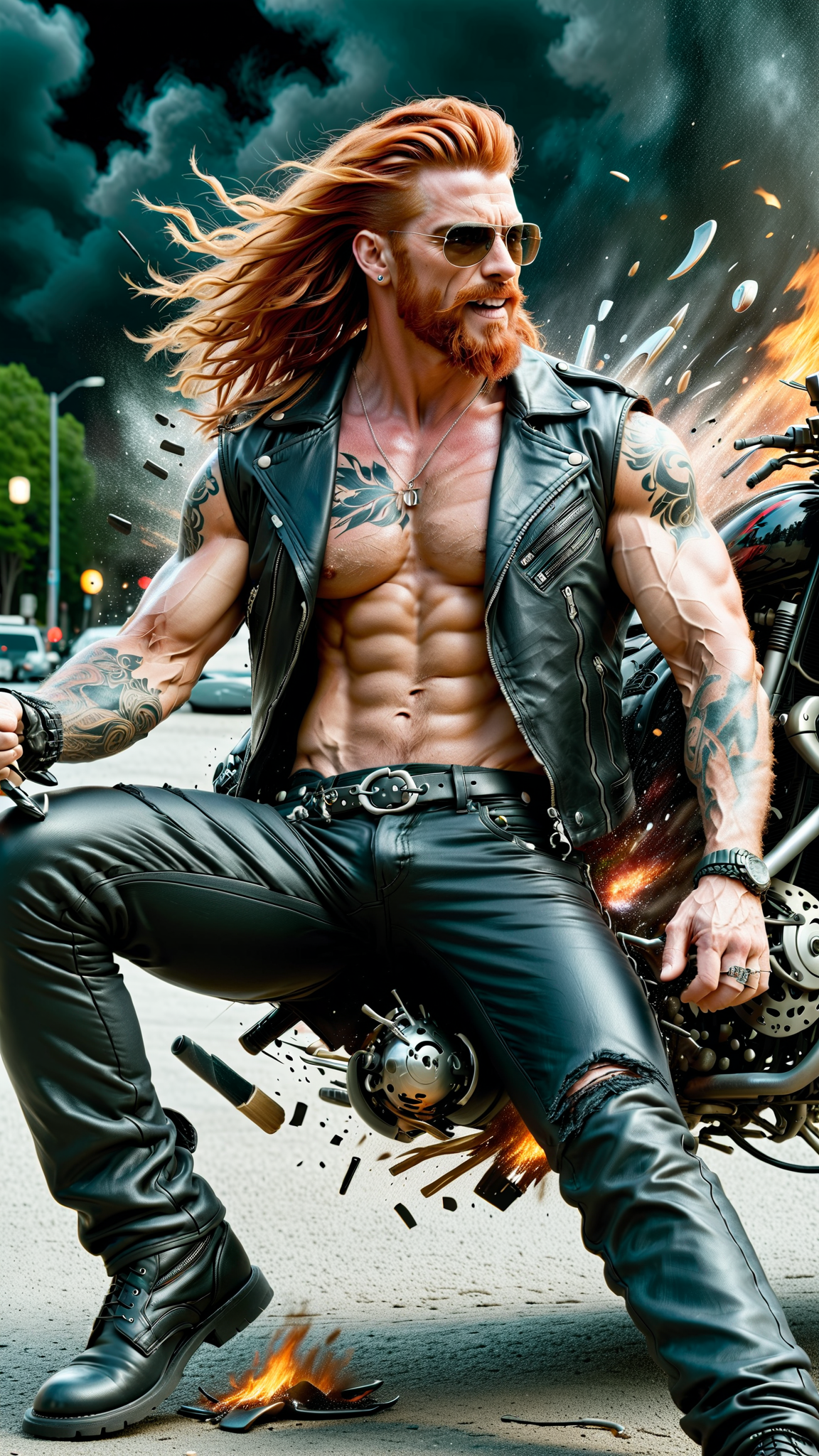 Dangerously sexy. Male motorcycle/biker gang member. Heavy Metal, Hard Rock. Mature man, handsome face, thick red goatee, jade green eyes, masculine, manly, very tall, muscular, sinewy, broad chest, big biceps. long wild locks of flaming red hair, slightly hairy chest, tattoos on arms and chest. Black leather vest exposing chest. black leather pants and boots, studded belt around waist. Surly grin. lying back, legs open, huge crotch. Full body pose.