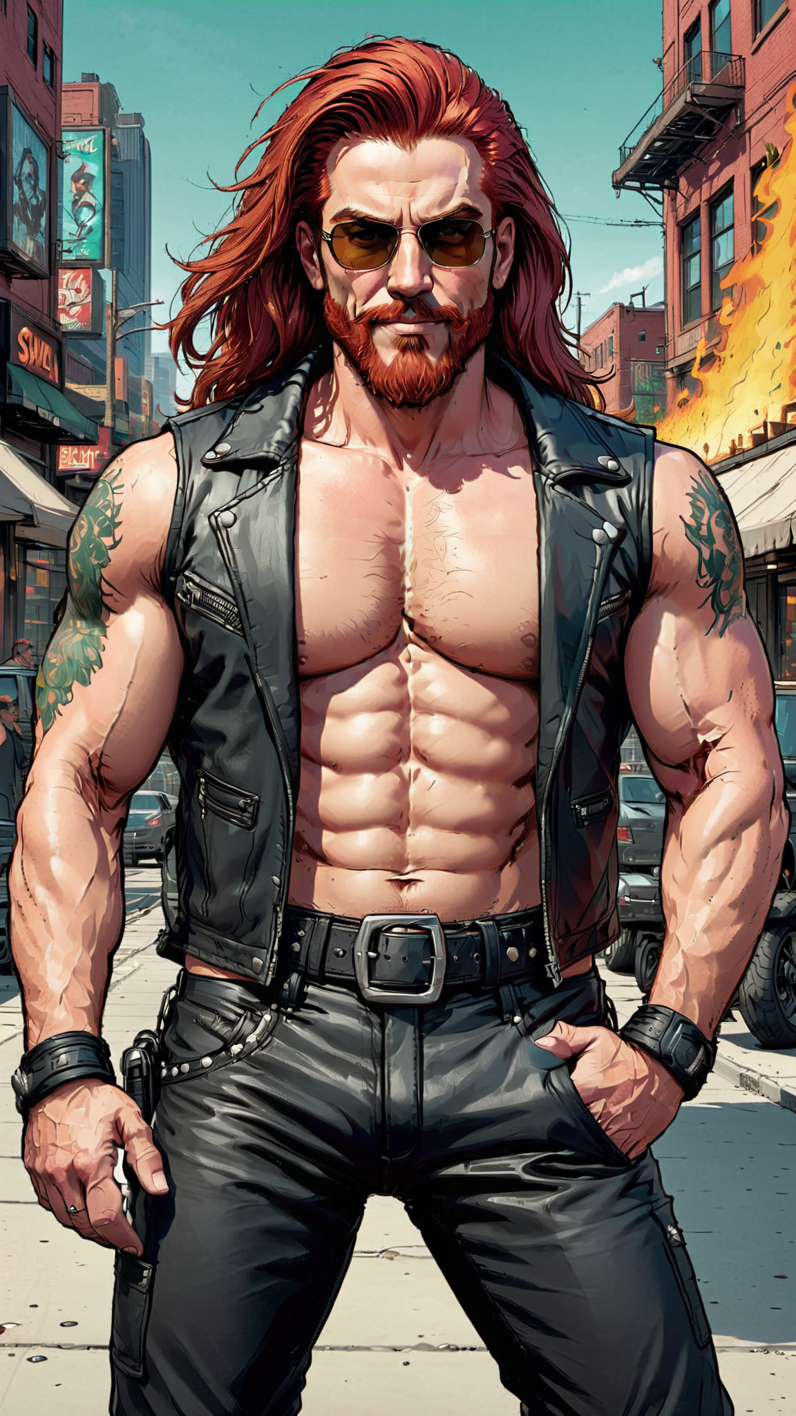 Dangerously sexy. Male motorcycle/biker gang member. Heavy Metal, Hard Rock. Mature man, handsome face, thick red goatee, jade green eyes, masculine, manly, very tall, muscular, sinewy, broad chest, big biceps. long wild locks of flaming red hair, slightly hairy chest, tattoos on arms and chest. Black leather vest exposing chest. black leather pants and boots, studded belt around waist. Surly grin. lying back, legs open, huge crotch. Full body pose.