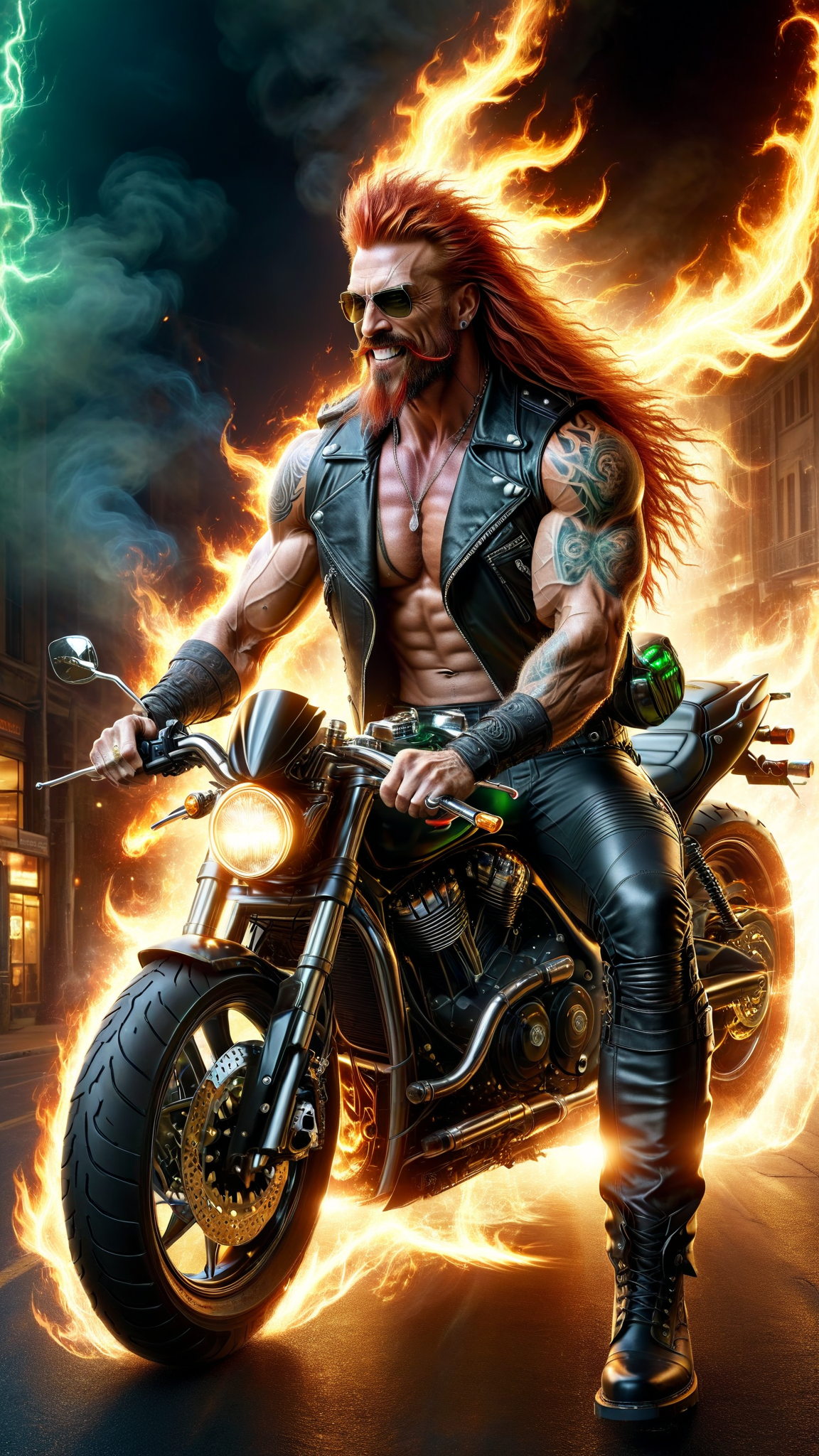 Dangerously sexy. Male motorcycle/biker gang member. Heavy Metal, Hard Rock. Mature man, handsome face, thick red goatee, jade green eyes, masculine, manly, very tall, muscular, sinewy, broad chest, big biceps. long wild locks of flaming red hair, slightly hairy chest, tattoos on arms and chest. Black leather vest exposing chest. black leather pants and boots, studded belt around waist. Surly grin. lying back, legs open, huge crotch. Full body pose.