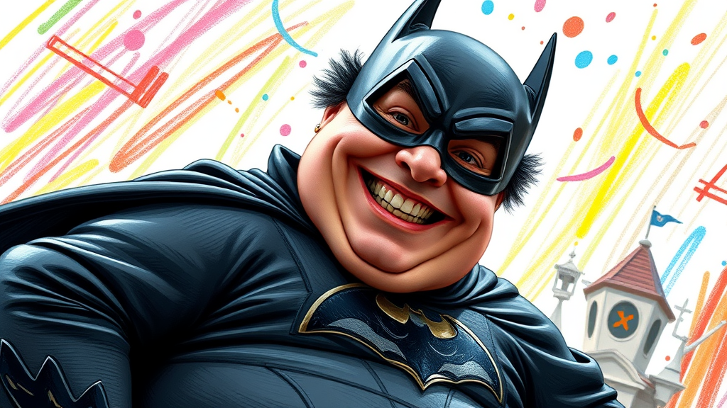Danny DeVito dressed in a Batman suit, plump and joyful, boasting a wide, Joker-like grin. The scene features a fantasy backdrop reminiscent of a whimsical crayon scribble, with an amateurish, basic draft style, capturing the essence of a point-and-shoot cartoon. The image showcases vibrant, unusual colors, giving it a surreal and slightly bizarre appearance, while maintaining an overall playful and imaginative atmosphere.