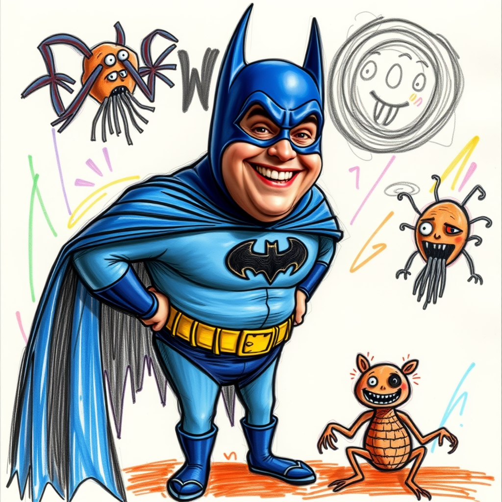 Danny DeVito dressed in a blue Batman suit, chubby and cheerful with a wide Joker grin, standing against a fantasy backdrop reminiscent of a child's crayon drawing. The scene captures an amateurish, cartoon-style draft with odd colorful scribbles. DeVito, with exaggerated features and warped proportions, is surrounded by surreal creatures with peculiar limbs. The composition is a unique blend of whimsy and bizarre, bringing an outlandish world to life.