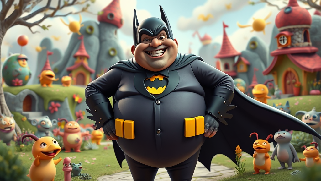 Danny DeVito dressed in a playful Batman suit, plump and cheerful, flashing a Joker-like grin. Surrounded by a whimsical fantasy landscape, the scene has an amateurish, cartoonish feel, reminiscent of child-like crayon scribbles with an emphasis on basic, point-and-shoot artistic style. Rendered in quirky 3D with odd, vibrant colors, this image maintains a surreal and comical atmosphere. Multiple whimsical creatures populate the background, adding to the fantasy vibe.
