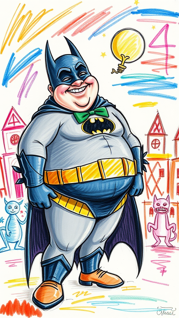 Danny DeVito in a whimsical Batman suit, plump and joyful, grinning like the Joker, set against a fantasy backdrop scribbled with childlike crayon strokes. The scene is a basic draft with vibrant, unconventional colors creating a cartoonish, surreal atmosphere. The artwork includes slightly offbeat elements, with quirky creatures and unusual features, maintaining a playful yet bizarre essence.