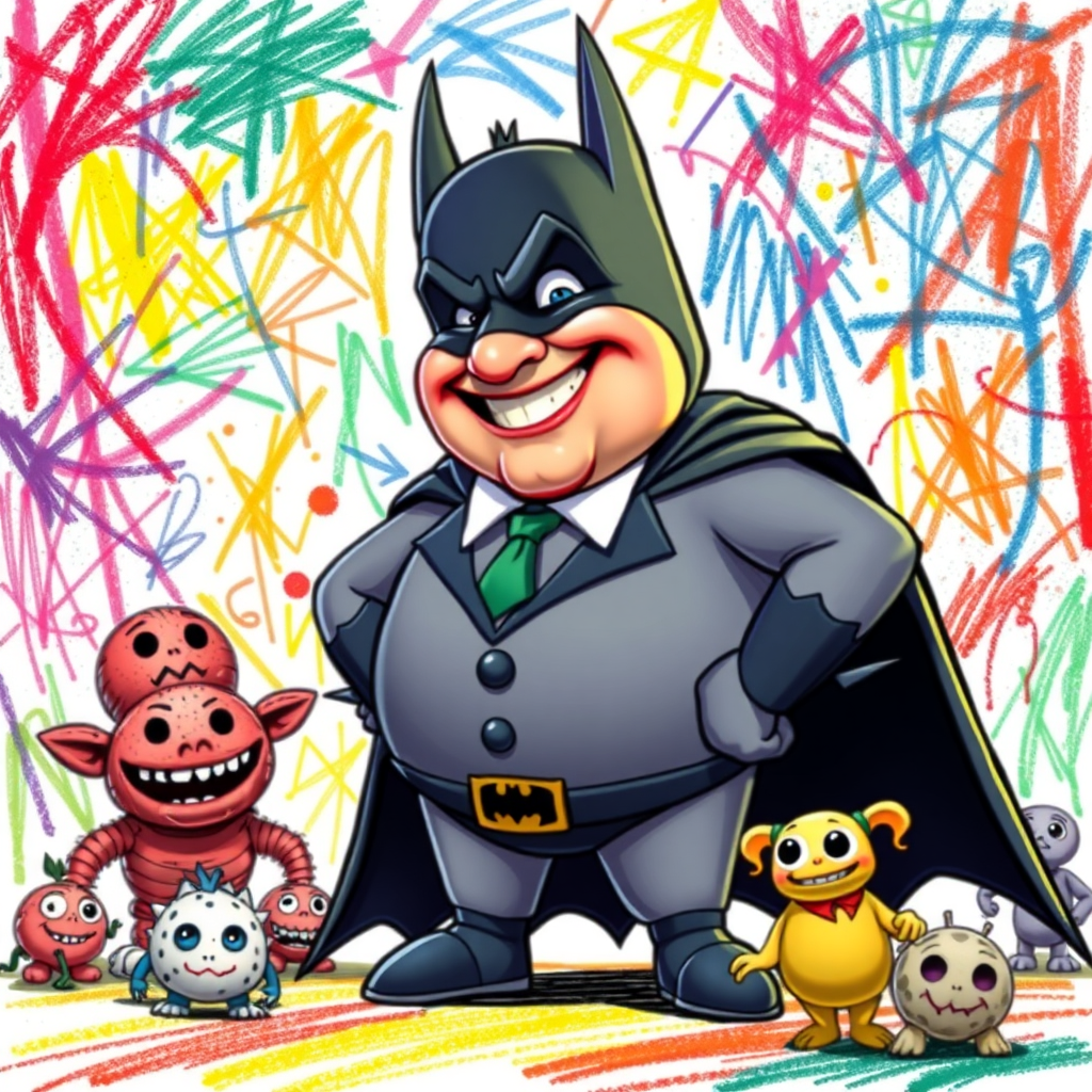 Danny DeVito in a whimsical Batman suit, plump and joyful with a mischievous Joker grin, set against a fantastical backdrop of vibrant, haphazard crayon scribbles. The basic cartoon draft features 3D elements with a surreal mix of bizarre colors, showcasing playful exaggerations in style. The scene includes imaginative creatures and quirky shapes, creating a delightful, offbeat atmosphere that embraces a childlike charm and humor.