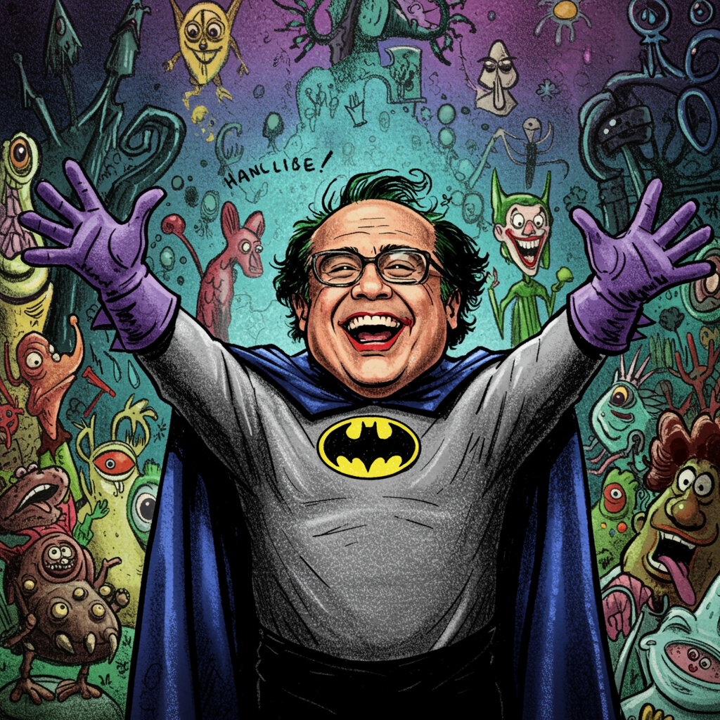Danny DeVito joyfully donning a Batman suit with a gleeful Joker grin, set against a whimsical fantasy backdrop, depicted in a childlike crayon scribble style. Embrace amateurish cartoon qualities with peculiar color choices, producing a unique and humorous scene where exaggerated features meet playful artistic interpretation. The setting includes distorted perspectives and quirky creatures intermingling in the background, enhancing the overall sense of cheerful absurdity.