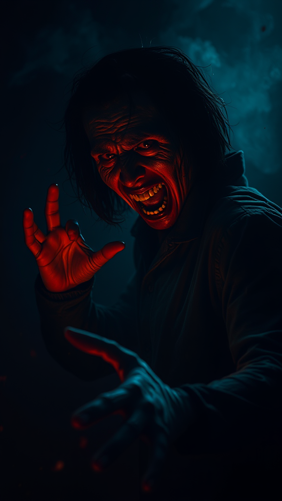 Dark and eerie atmosphere, shadows intertwining with flickering lights, ferocious horror elements, vivid detailing of blood splatter, reminiscent of Donnie Darko’s haunting essence, sinister laughter echoes, dramatic and dynamic character pose, captivating and immersive background, ultra high-resolution clarity, 8k quality, raw photography feel, hyperrealistic textures, intense and suspenseful mood, intricate depth, chilling and gripping visual narrative.