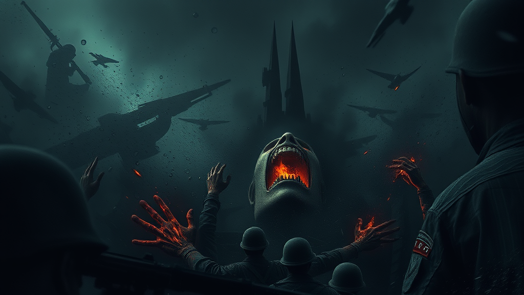 Dark and haunting depiction of war's terror, showcasing anguish and despair amid chaos, vivid cries and visceral imagery against a somber backdrop, shadowy tones, horror-drama fusion, artistic masterpiece in digital expressionism, nuanced hues, somber and emotionally resonant, leaving an indelible mark on the psyche, intricately detailed, high-caliber.