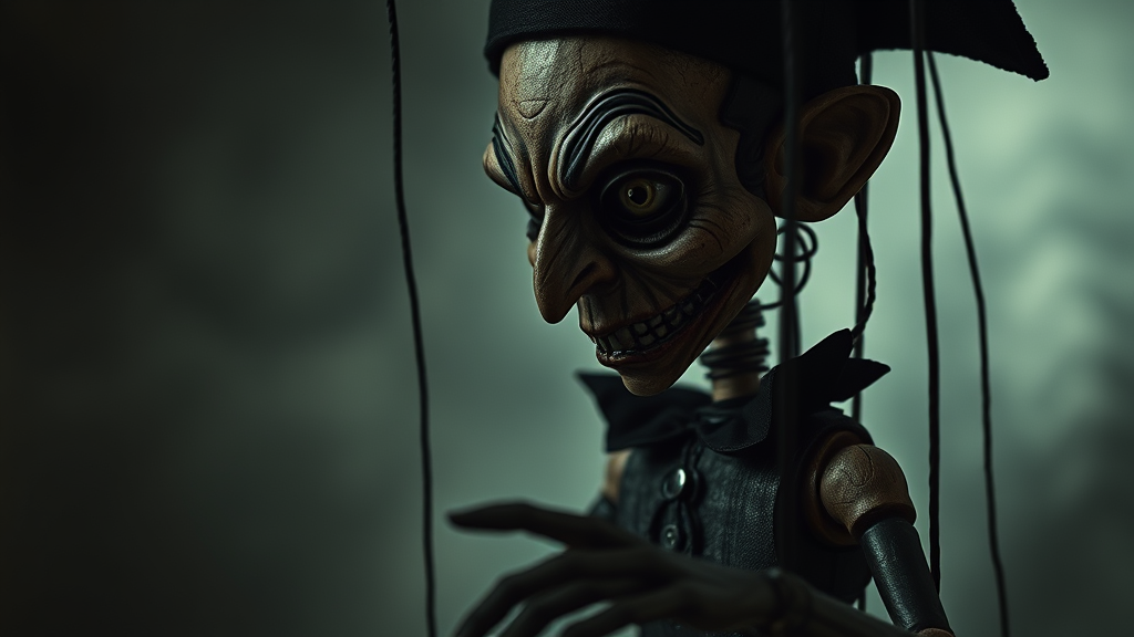 Dark and sinister marionette resembling Pinocchio, exuding an aura of malevolence, with twisted features and piercing, unsettling eyes, captured in a detailed portrait reminiscent of D&D fantasy art, set in a shadowy landscape, elongated limbs and intricate wooden textures casting eerie shadows, eerie yet captivating in its unsettling beauty, a blend of dark magic and folklore.