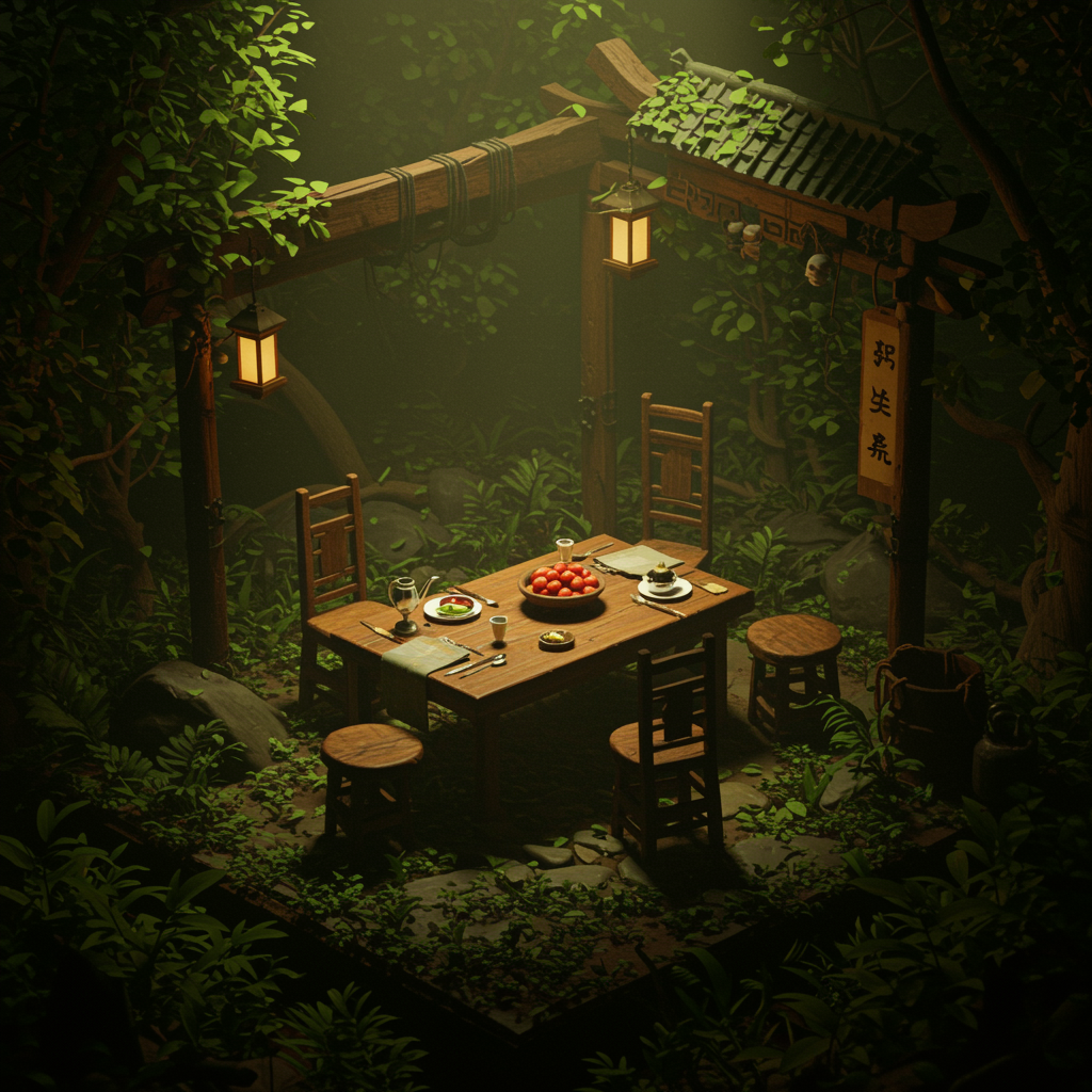 Dark atmospheric lighting with an olive hue casts a mysterious glow over the table set in a hyper-detailed, vibrant forest. The composition is epic and meticulously crafted, capturing the essence of an isometric view with an Asian-Chinese influence. The setting exudes a 'BadDream UnrealisticDream' vibe, presented in stunning 4k UHD with Octane render technology, ensuring sharp focus and high resolution. The scene is rich in dark vibes, creating an enchanting blend of the real and surreal.
