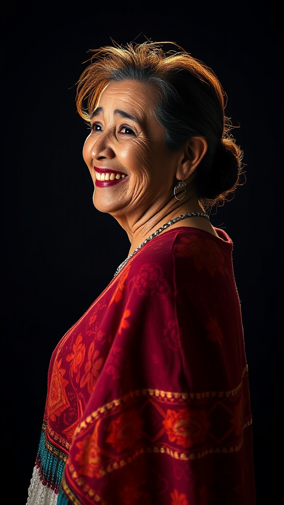 Dark backdrop, dramatic illumination, backlight effect, subtle rim light, Mexican woman age 44, joyful expression, profile view, full body stance, wearing a vibrant and semi-translucent poncho, adorned in silver jewelry, high-definition quality, 4k, 8k resolution, ultra-high-resolution, HDR raw photograph, sharp focus, complex textures, visible skin details, expressive and glossy eyes, no text or extraneous elements.