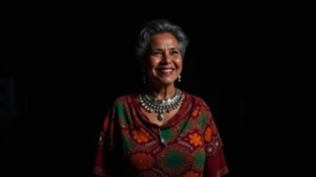 Dark background, dramatic lighting, subtle backlight highlighting edges, rim lighting contouring figure, Mexican woman aged 44, joyful expression, side profile, standing full body, wearing a vibrant and translucent poncho, accentuated by intricate silver jewelry, captured in 4k and 8k resolution, ultra high-resolution HDR raw photo, focused sharply on intricate textures, natural skin details, expressive glossy eyes with intense highlights, emphasizing a sense of authenticity and vibrant character.