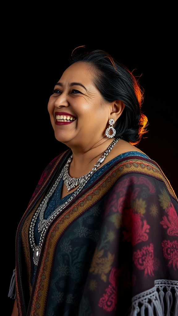 Dark background dramatic light backlight rim lighting Mexican woman 44yo laughing similar to side profile standing full body colorful translucent poncho adorned with silver jewelry best quality 4k 8k ultra highres raw photo in hdr sharp focus intricate texture showcasing skin imperfections detailed eyes glossy highlighted eyes avoiding text letters extra fingers maintaining core inspiration