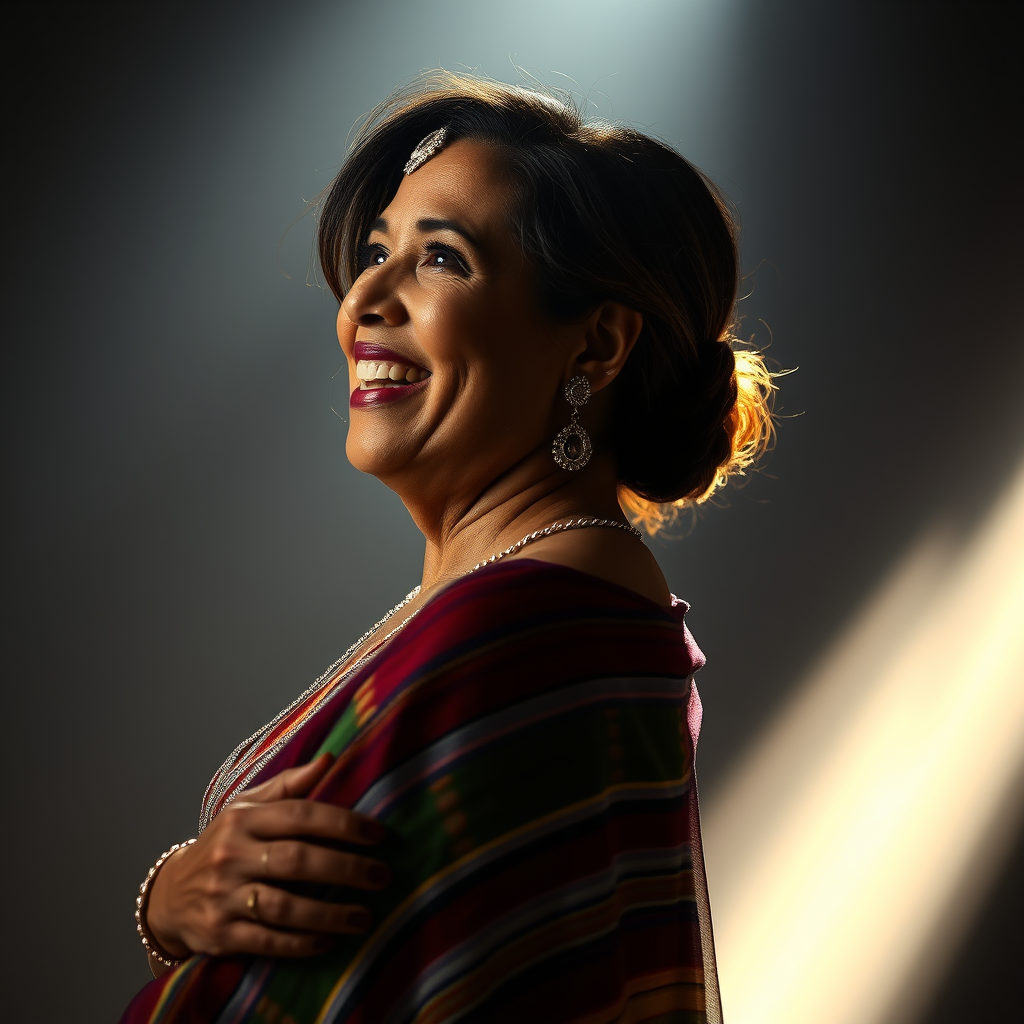 Dark background dramatic light backlight rim lighting Mexican woman 44yo laughing side profile standing full body colorful translucent poncho silver jewelry ultra high quality 8k sharp focus intricate texture skin imperfections detailed glossy eyes highlighted eyes vibrant authenticity natural elegance authentic emotions dynamic pose rich cultural attire atmospheric depth warmth confidence serene expression