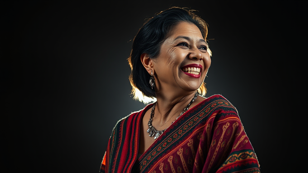 Dark background dramatic light backlight rim lighting Mexican woman 44yo laughing resembling from side full body standing colorful poncho translucent silver jewelry best quality 4k 8k ultra highres raw HDR photo sharp focus intricate texture skin imperfections detailed eyes glossy highlighted eyes realistic features natural imperfections capturing genuine emotion vivid colors gleaming silver thematic illumination captivating scene