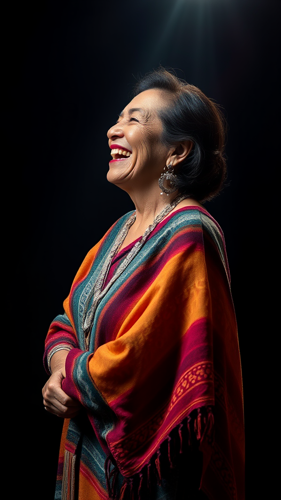 Dark background dramatic lighting backlighting rim lighting Mexican woman 44yo laughing side profile standing full body wearing a vibrant semi-transparent colorful poncho adorned with intricate silver jewelry in best quality 8k ultra high-res raw HDR sharp focus detailed textures showcasing natural skin and eye details with glossy eyes no text or extra fingers