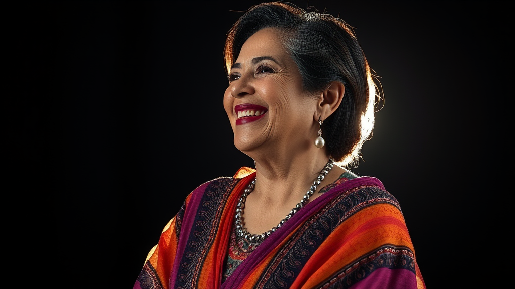 dark background dramatic lighting backlit rim lighting Mexican woman 44 years old laughing side profile standing full body colorful translucent poncho silver jewelry high quality ultra high-resolution raw photo HDR sharp focus intricate texture natural skin details detailed glossy eyes vibrant eyes mesmerizing expression unique style artistic composition enhanced shadows and highlights elegant poise realistic depiction natural imperfections sophisticated allure captivating presence
