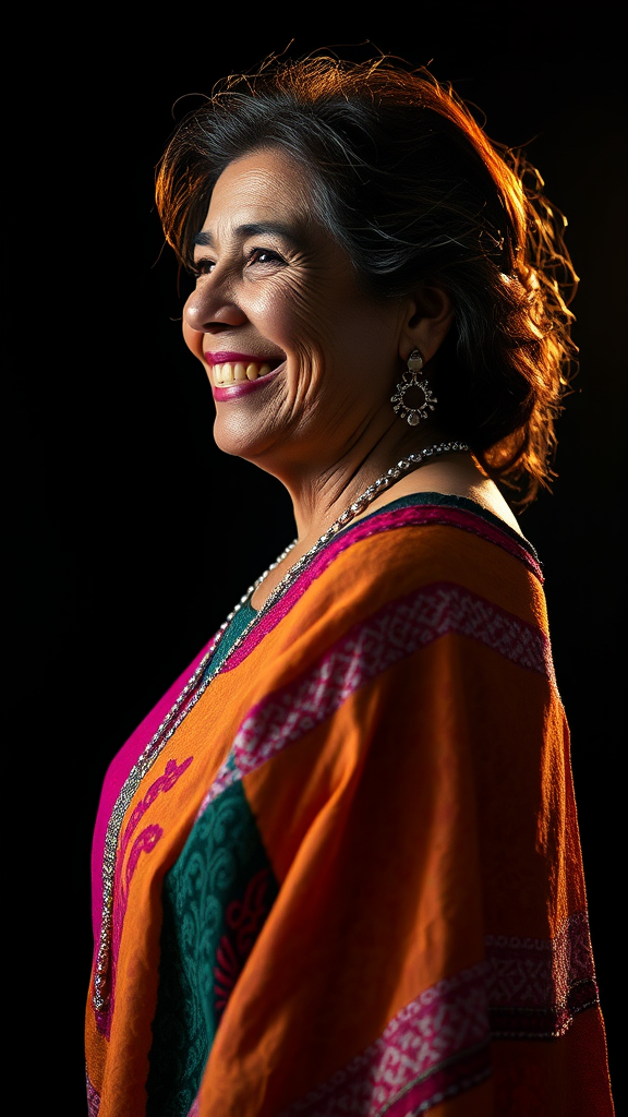 Dark background dramatic lighting backlit rim lighting featuring a 44-year-old Mexican woman resembling a joyful expression seen from the side standing full body adorned in a vibrant, translucent poncho embellished with intricate silver jewelry captured in best quality 8k ultra high-resolution raw HDR photo sharp focus intricate texture depicting natural skin imperfections with detailed glossy highlighted eyes maintaining authenticity essence.
