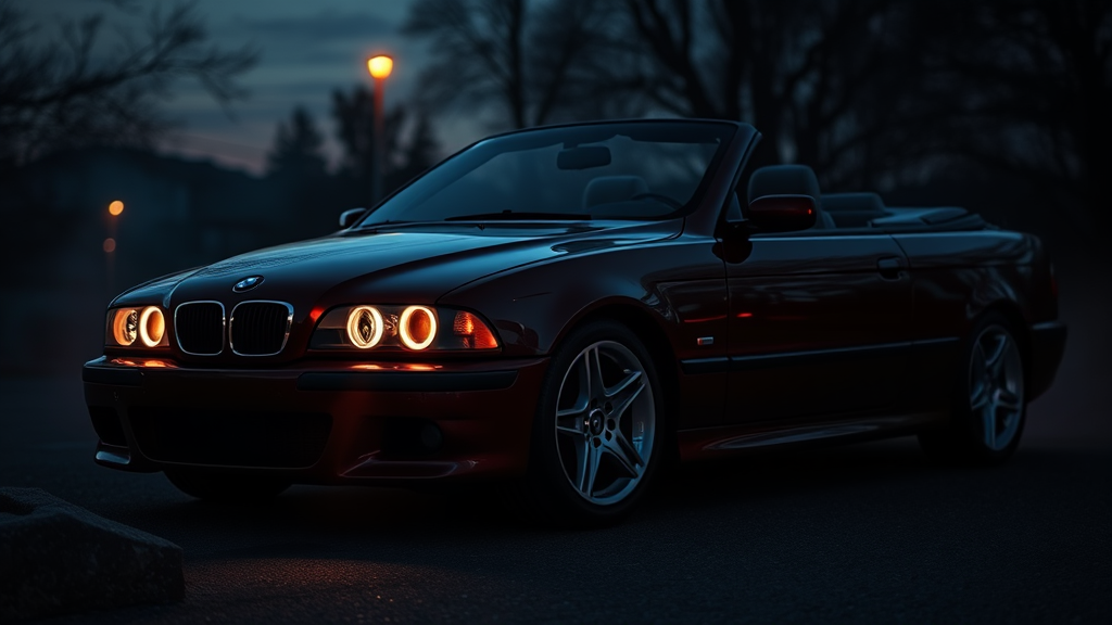 Dark crimson BMW E39 M5 convertible, glowing angel eyes piercing through a dim evening, cinematic ambiance enveloping the scene, hyper-realistic portrayal with exquisite detail, 8k resolution capturing every curve and reflection, a slight mist adding mystery to the tranquil night, shadows dancing along the sleek body, the perfect harmony of power and elegance in a twilight embrace.