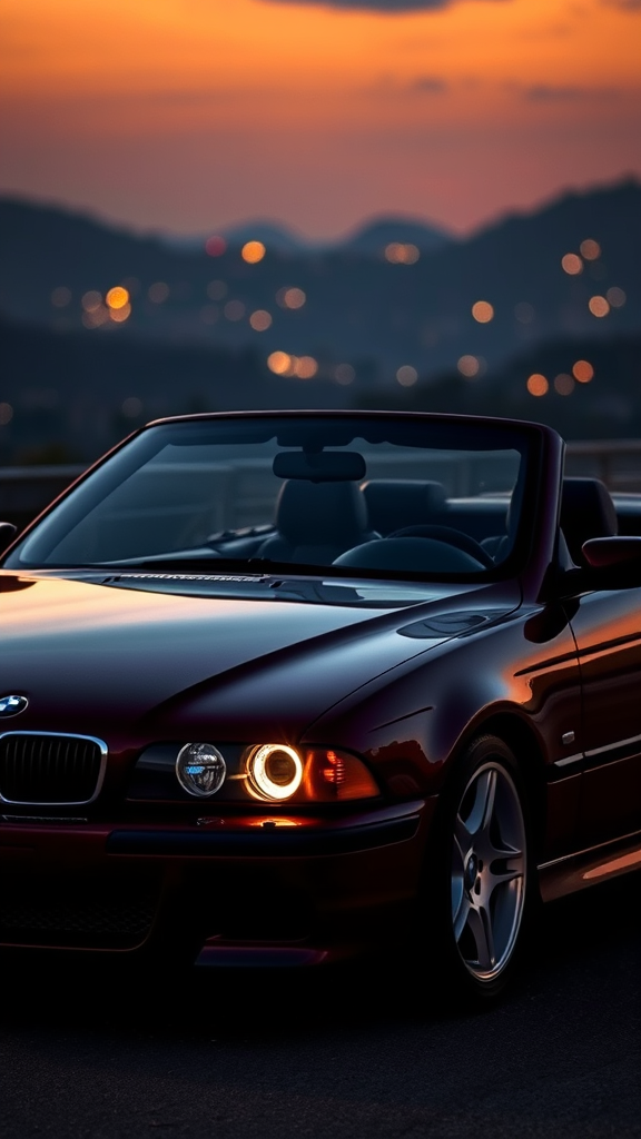 Dark crimson BMW E39 M5 convertible, glowing angel eyes, cinematic ambiance, ultra-realistic, highly detailed, 8k resolution, set against a dusky evening backdrop, soft reflections highlighting sleek curves, gentle breeze ruffling the interior, subtle city lights twinkling in the distance.