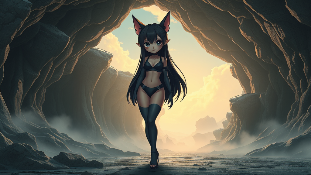 Dark elf fitness girl in a vast underground cave complex, night elf, black hair, mascara, reflective eyes, makeup, cute nose, athletic body, wearing high heels, foggy atmosphere, trending on ArtStation and CGSociety, intricate and high detail, dramatic scene, cat ears, sky with clouds, outdoors, canvas frame, cartoon style, 3D elements, unique color palette, high-quality, ultra-detailed, 8k UHD, DSLR photography style, soft lighting, film grain, inspired by Fujifilm XT3, best quality, seamless anatomy, captivating composition.