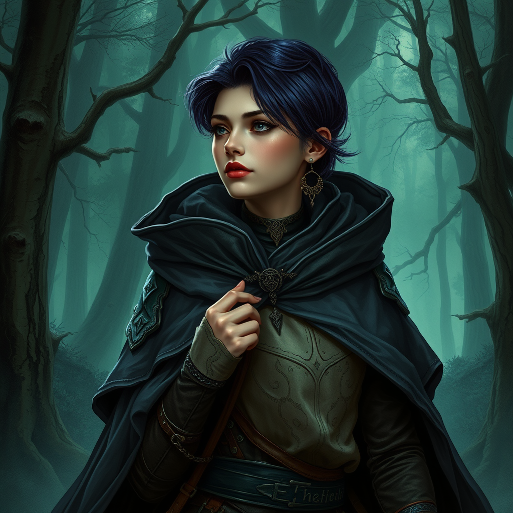 Dark enchantress, explorer attire, voluminous cloak, enchanting woodland landscape, shimmering dragon scales, arcane sorcery, stylish coiffure, closely-cropped hair tinged with deep purple-indigo, twilight ambiance, elaborate, sophisticated, sharp clarity, illustration, hyper-detailed, digital painting, concept art, ethereal jade mist, matte painting, influenced by VLOP, Artgerm, Greg Rutkowski, and Alphonse Mucha, visual masterpiece.