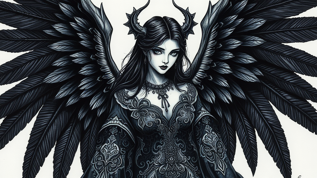 Dark ethereal goddess, intricately detailed with ballpoint pen strokes, looming with majestic black wings, her eyes shimmering with otherworldly wisdom, clad in an elaborate intricately designed robe that whispers secrets of the night.