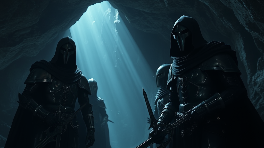 Dark fantasy scene featuring shadow knights in a mystical cave setting, the ambiance enhanced by transparency and caustic lighting effects that create a surreal magical atmosphere. The knights, rendered with perfect anatomy and impeccable detail, command the scene in stunning 32k UHD resolution, capturing the essence of a realist photo with high-quality professional craftsmanship. The cinematic angle reveals subtle reflections and the nuanced play of light, offering a close-up view that immerses the viewer in the mysterious depths of this otherworldly masterpiece.