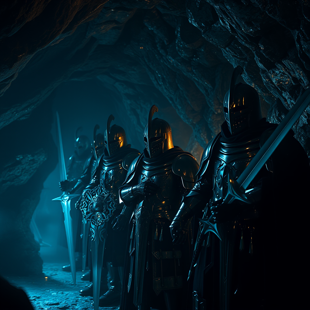 Dark fantasy scene featuring shadow knights in a mystical cave setting, illuminated by ethereal caustics and surreal optics, showcasing mesmerizing magic. The knights exhibit perfect anatomy with gleaming armor, captured in stunning 32k UHD resolution and best quality high-res detail. The realistic photo displays a cinematic angle and expertly captures reflection lights on the cave's walls. The composition is enhanced by closed-up professional photography, creating a masterpiece of shadowy elegance and mystique.