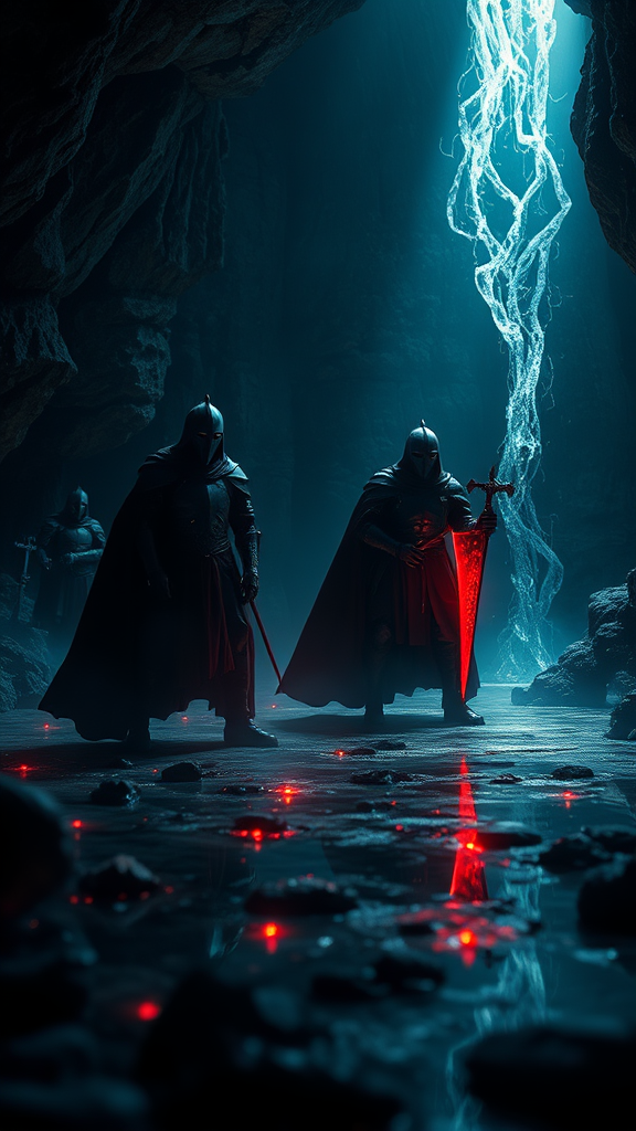 Dark fantasy scene featuring shadow knights in a mysterious cave setting, with an emphasis on transparency and surreal magic. The environment is an optical masterpiece, showcasing perfect anatomy and dynamic poses in 32k UHD resolution. The image is captured with best quality high-resolution professional photography, offering a cinematic angle that highlights the knights with reflection lights and caustics. The scene is infused with a sense of realism akin to a professional photo shoot, capturing the enigmatic essence of the shadow knights in a closed-up perspective, surrounded by an aura of otherworldly magic.