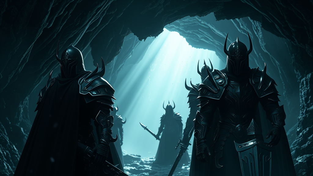 Dark fantasy scene featuring shadow knights in a mystical cave environment, showcasing transparency and mesmerizing caustics. The setting is imbued with surreal magic, capturing a masterpiece of perfect anatomy and rendered in stunning 32k UHD resolution. The image boasts the highest quality and high-resolution details, resembling realistic professional photography with a cinematic angle. The enchanting atmosphere is enriched by intricate reflection lights, providing a close-up view of the shadow knights, their intricate armor gleaming with an otherworldly aura.
