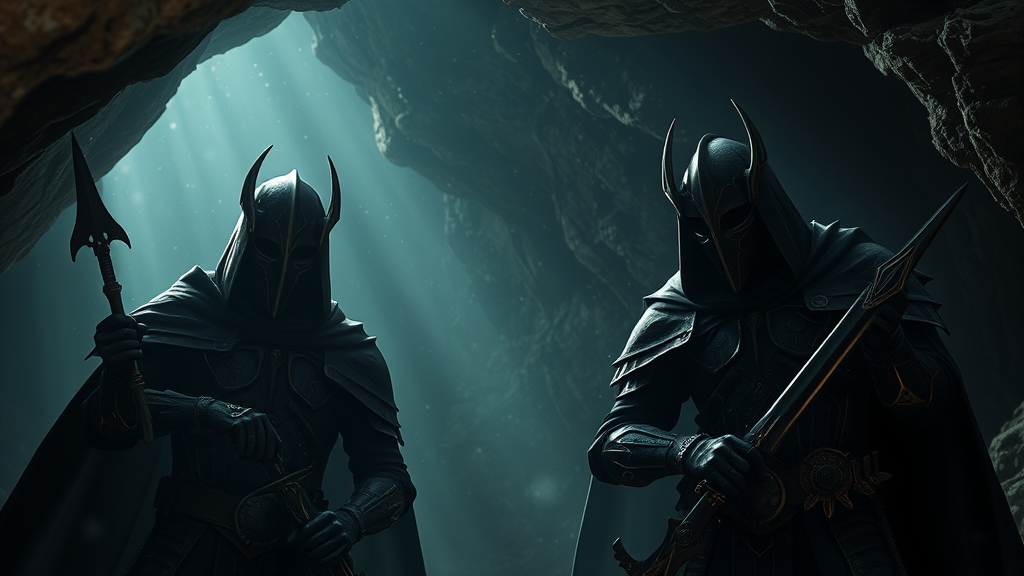 Dark fantasy, shadow knights, cave setting, transparency, caustics, optics, surreal, magic, masterpiece, flawless anatomy, ultra-high-definition resolution, best quality, highly detailed, photorealistic portrait, professional photography, cinematic composition, reflection lighting, sharp focus, 2D, mystical, enchanting, otherworldly, ethereal, atmospheric, captivating, mysterious, alluring, vivid, lifelike, breathtaking, exquisite, immersive, imaginative, enchanting details, shadowy figures, magical ambiance.