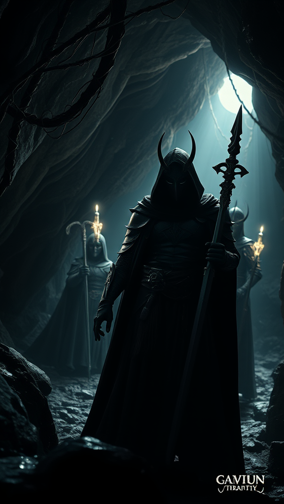 Dark fantasy shadow knights in a mysterious cave setting, characterized by transparency and surreal magical elements. The scene captures the intricate play of caustics and optics, creating an otherworldly atmosphere. The composition boasts perfect anatomy and is rendered in breathtaking detail, showcasing 32k UHD resolution with the highest quality and realism. The image evokes the style of professional photography, with a cinematic angle emphasizing reflection lights in a close-up view, elevating the scene to masterpiece level.