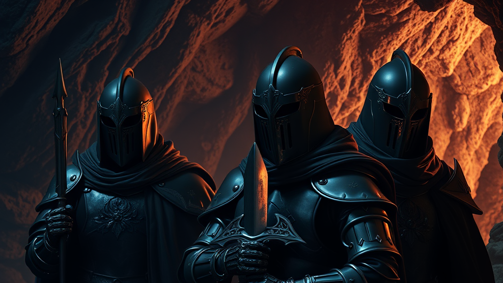Dark fantasy world with shadow knights set in a mysterious cave background, showcasing transparency, surreal magic, and caustics that play with optics. A photorealistic portrait masterpiece with perfect anatomy captured in 32k UHD resolution, offering the best quality and highly detailed imagery. The scene is shot with a professional photography touch from a cinematic angle, utilizing reflection lights and 8k sharp focus. The knights and their surroundings are illustrated with impeccable detail and realism, ensuring a captivating visual experience free from negative elements like unrealistic anatomy, poor composition, or unclear features.